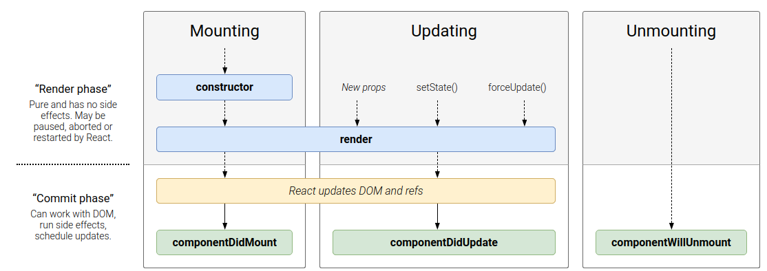 이후 New props, setState(), forceUpdate() 등으로 상태가 업데이트되면 render함수를 재호 출하고, 이후 componentDidUpdate 상태가 된다.