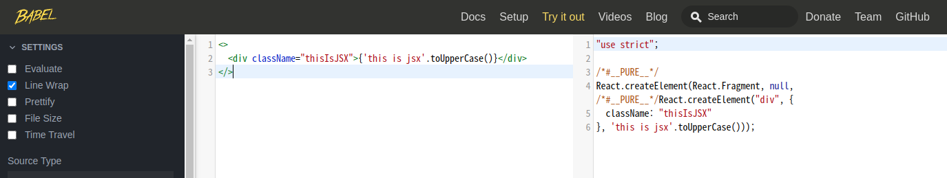 형태가 html과 유사한 문서 작성용 스크립트 언어이다. Babel ( 바벨 ) 이라는 컴파일러 ( 온라인에서 확인 가능 ) 를 통해 자바스크립트 언어로 변경된다. JSX에서는 특별하게 중괄호{} 를 통해 JavaScript 코드를 삽입할 수 있다.