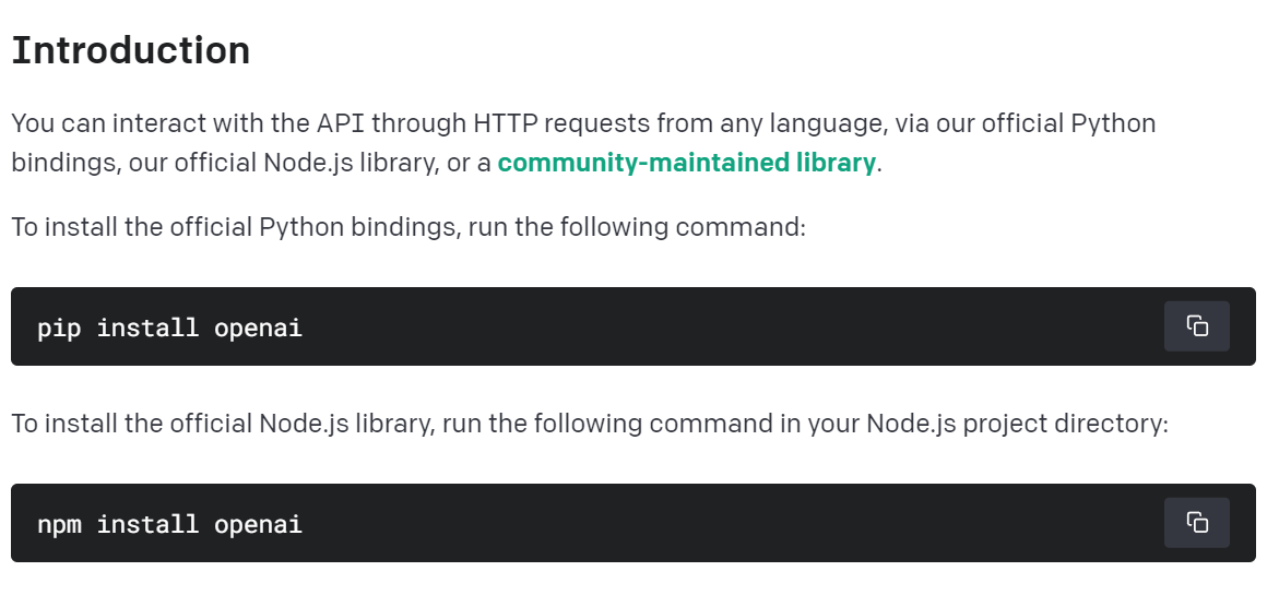 dotenv는 환경변수를 위해, readline은 CLI 입력을 위해 사용했으며, 오늘의 메인 주제는 openai가 되겠습니다. openAI API docs로 이동해 살펴보면, 다음과 같이 접근하게 정리되어 있습니다.