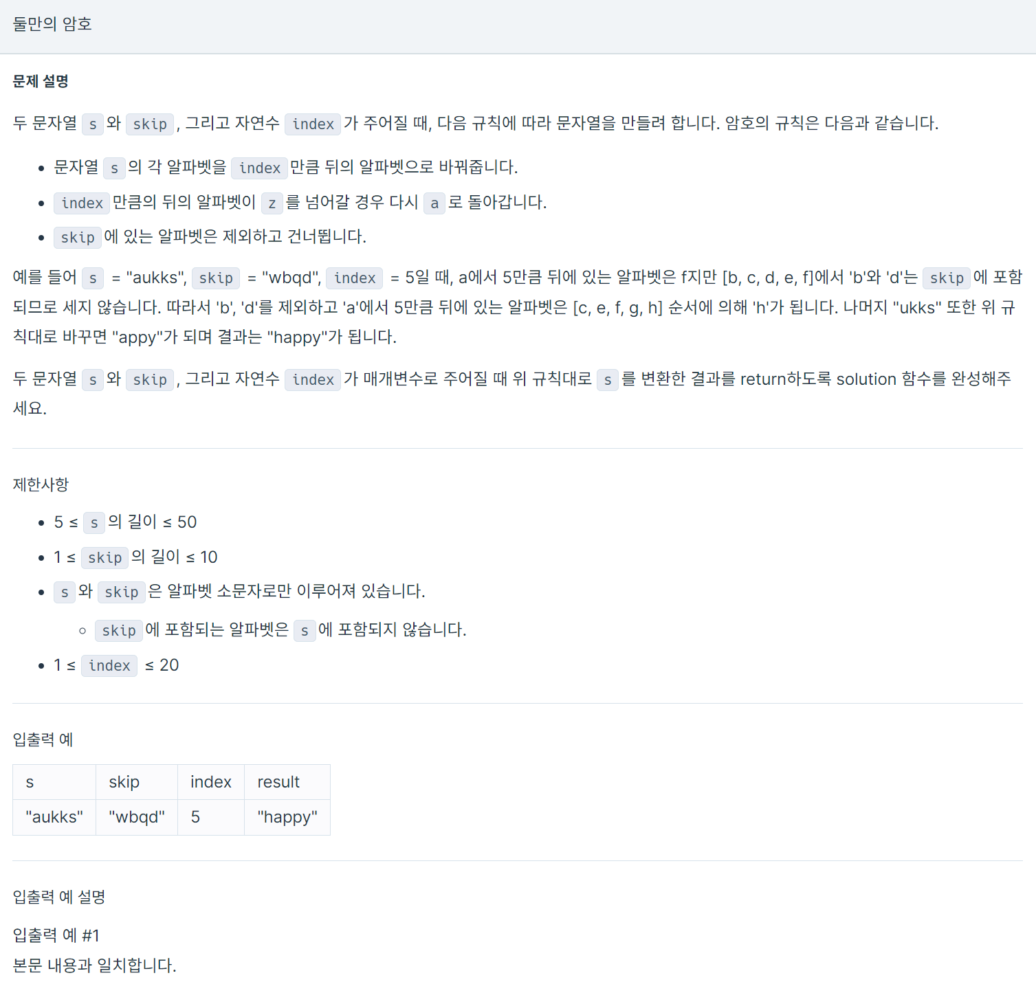 문자열 암호 문제입니다. 문자열 s의 각 요소를 index만큼 뒤의 알파벳으로 치환하여 리턴하면 됩니다. 다만 이때 skip에 포함된 알파벳은 (index 만큼)에 포함되지 않습니다. 가벼운 마음으로 풀어보겠습니다.
