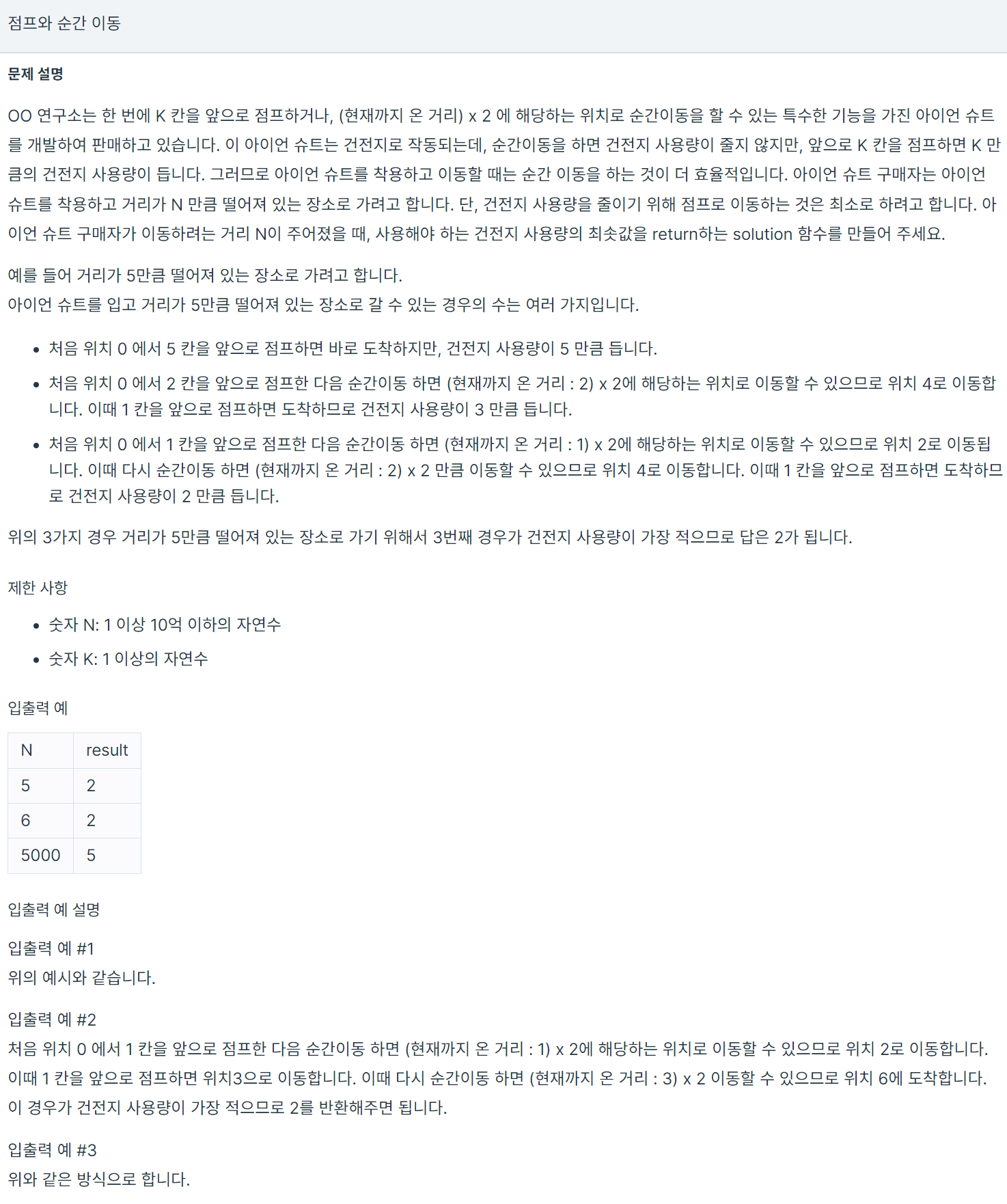 해당 문제는 주어진 거리 N을 0에서부터 순간이동과 점프를 이용하여 이동하며, 건전지 사용량이 최소가 되도록 하는 문제입니다. 순간이동은 현재까지 이동한 거리의 2배 만큼 거리를 이동하므로, 현재 위치를 2로 나누면서 이동하면서 필요한 점프 횟수를 계산하여 건전지 사용량을 구하면 됩니다.