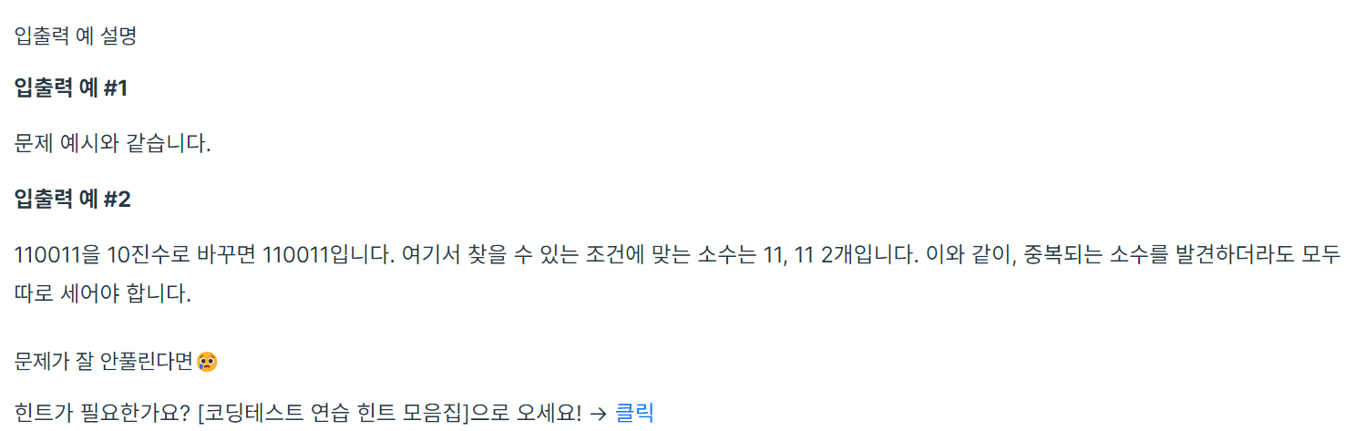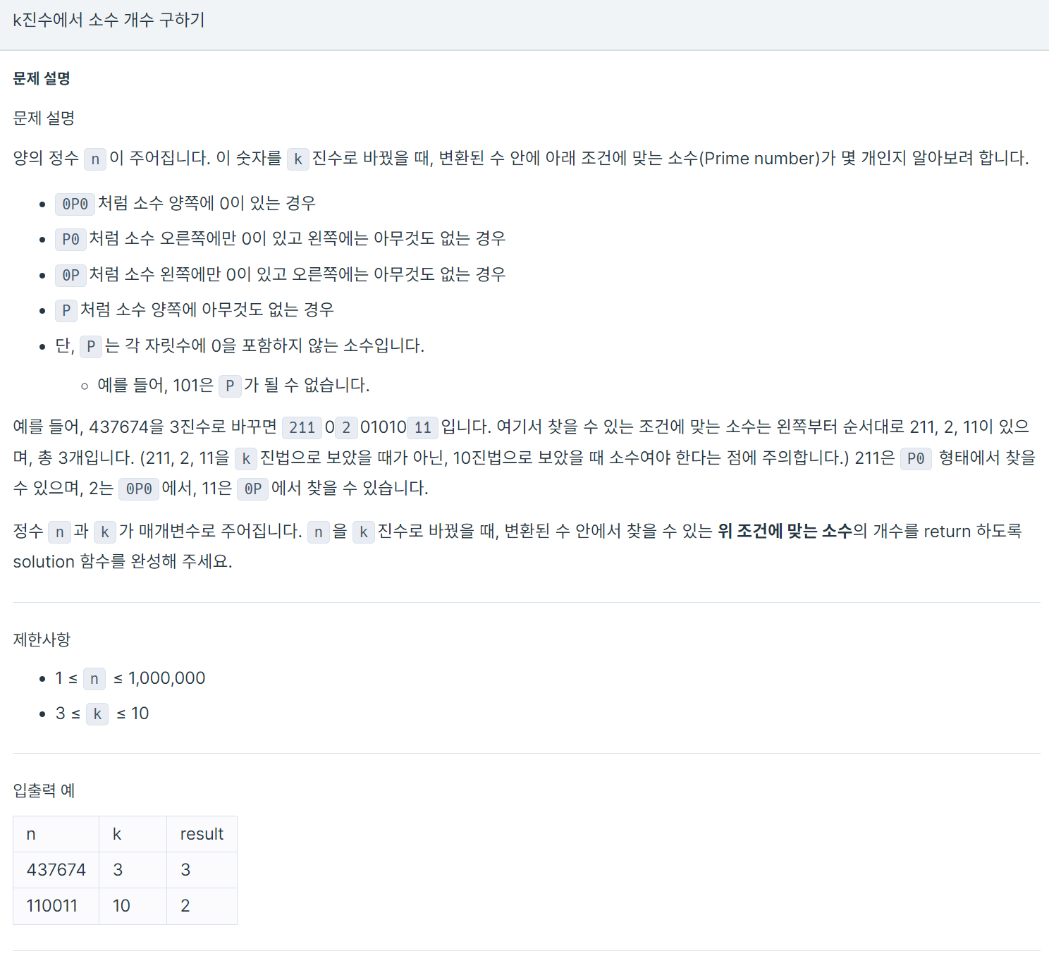 이 문제는 (1) 입력값 n을 k진수로 변환해서 조건에 맞는 정수를 얻는 문제와 (2) 각 정수들이 소수인지 판별하여 길이를 리턴하는 문제로 나눌 수 있습니다.
