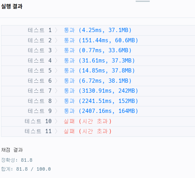 어지간하면 제가 시도한 내용에서 전부 통과는 되었어야 하나 시간초과가 발생했습니다. 그렇다는 건 근본적인 접근이 잘못되었다는 걸 뜻합니다. 다시 문제로 돌아가서 조금 고민을 해봅니다.