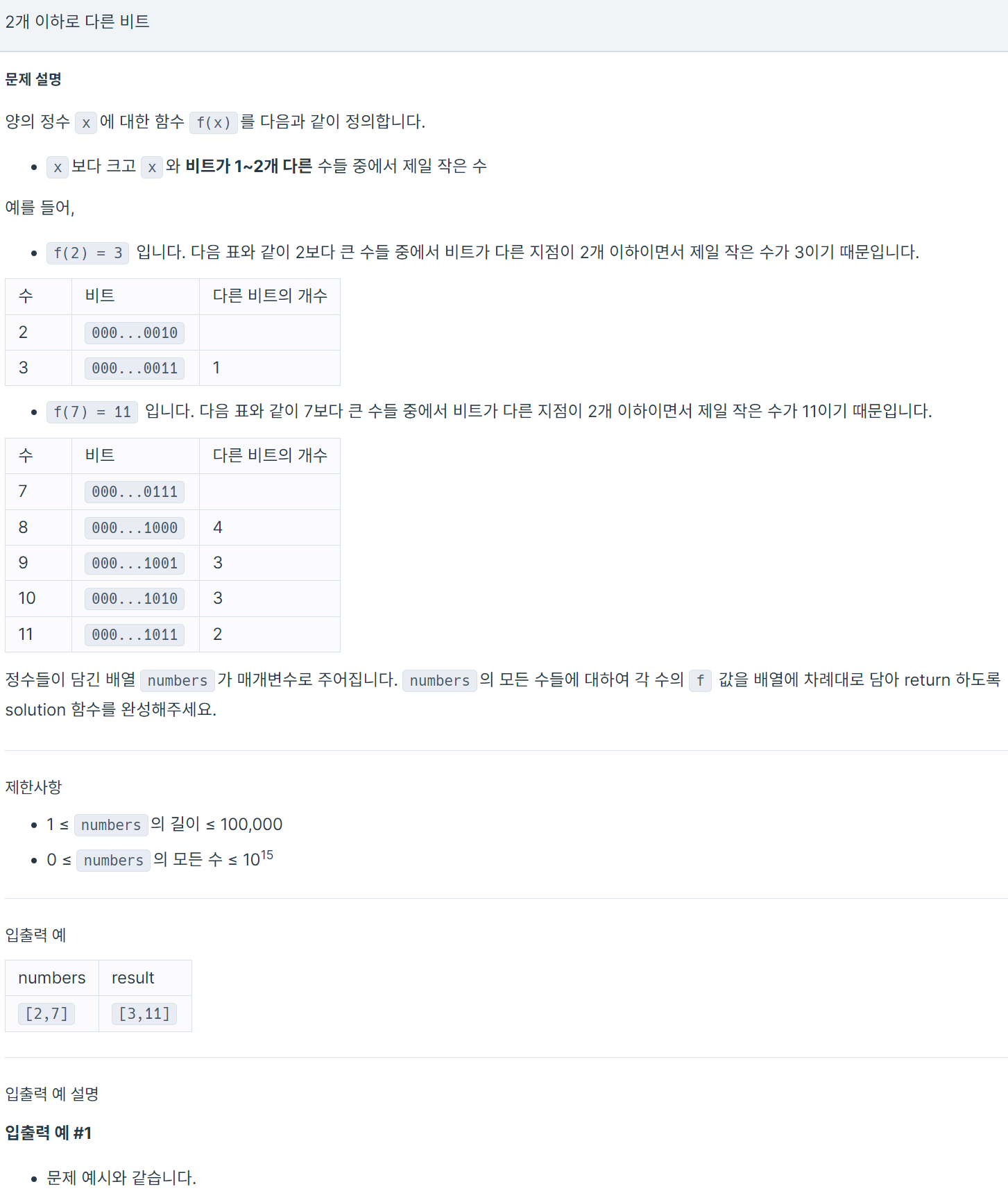 먼저 문제를 있는 그대로 바라보면, 입력받은 numbers의 각 요소를 순회하면서, 각 요소를 2진법으로 표기했을 때 비트가 1~2개 다른 수를 찾아 그 수로 해당 요소를 업데이트하는 문제입니다.