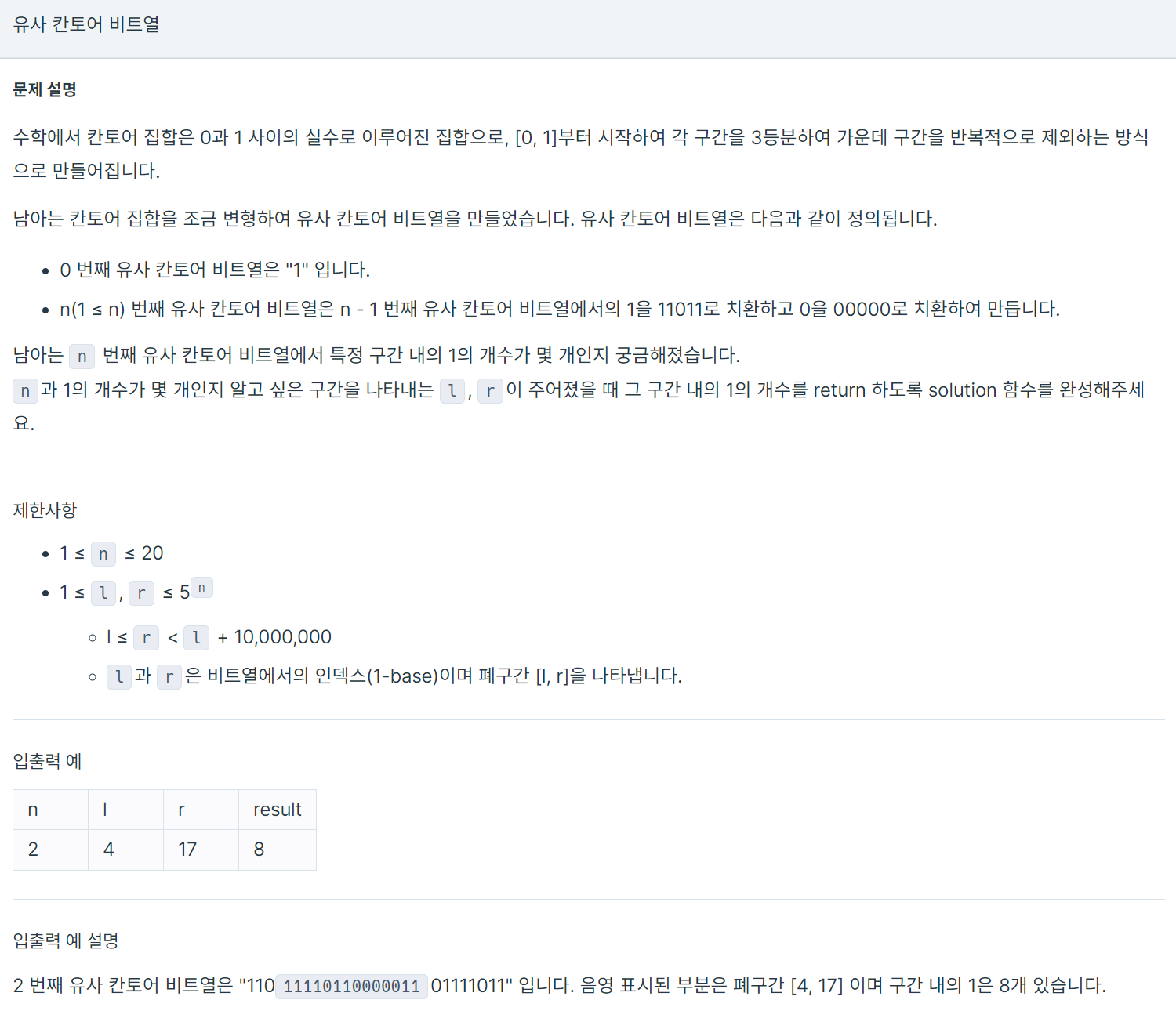 유사 칸토어 비트열을 생성하고, 해당 비트열의 l부터 r에 포함된 1의 갯수를 리턴하는 문제입니다. 최초 접근은 문제에서 요구한 대로 n-1번째의 "1"을 "11011"로, "0"을 "00000"으로 치환해 f(n)을 구해 slice(l-1, r)로 범위를 구하고 1을 카운트했습니다.