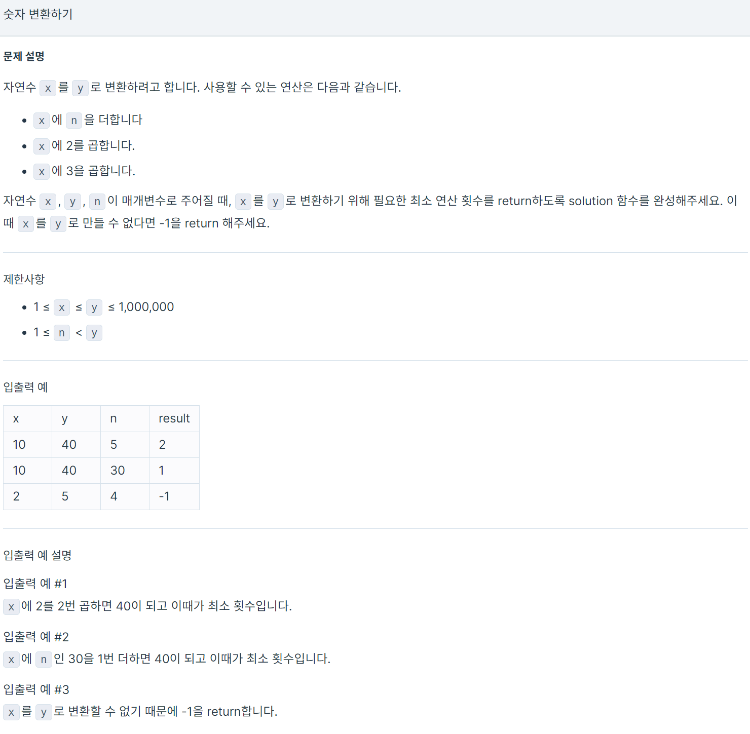 이 문제는 x에서 출발하여 y까지 도달하는 여정을 BFS 형태로 접근해서 해결하면 됩니다. memoization을 이용해 접근하면 반복된 연산을 줄일 수 있습니다.