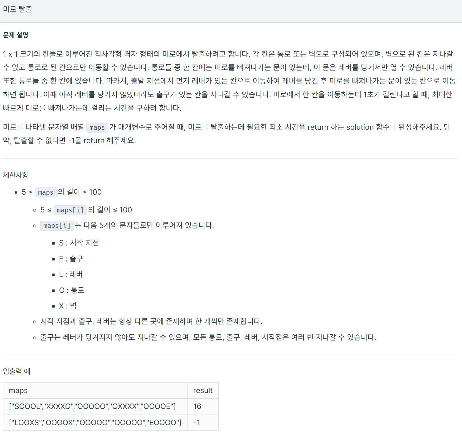 우선 문제에서 주어진 문자열 배열 maps를 2차원 배열로 변환하여 저장합니다. 그리고 시작 지점부터 BFS 탐색을 시작합니다. BFS 탐색을 진행하면서, 현재 위치가 레버인 경우는 레버를 당긴 상태와 끄는 상태를 나누어서 큐에 넣어줍니다. 이 때 레버를 당긴 상태에서는 레버 위치에서부터 탐색을 시작하고, 끄는 상태에서는 현재 위치에서부터 탐색을 시작합니다. 이렇게 함으로써 레버를 끄지 않고 출구까지 갈 수 있는 경우와 레버를 끄고 출구까지 갈 수 있는 경우를 모두 고려할 수 있습니다.