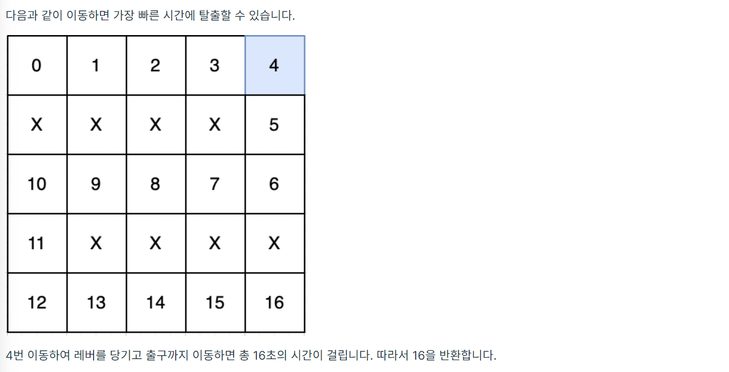 이 문제는 BFS 알고리즘을 이용하여 최소 시간을 구하는 문제입니다. 시작 지점부터 출구까지의 최소 시간을 구하면 되는데, 이 때 레버를 끌어야 하는 경우를 고려해야 합니다.