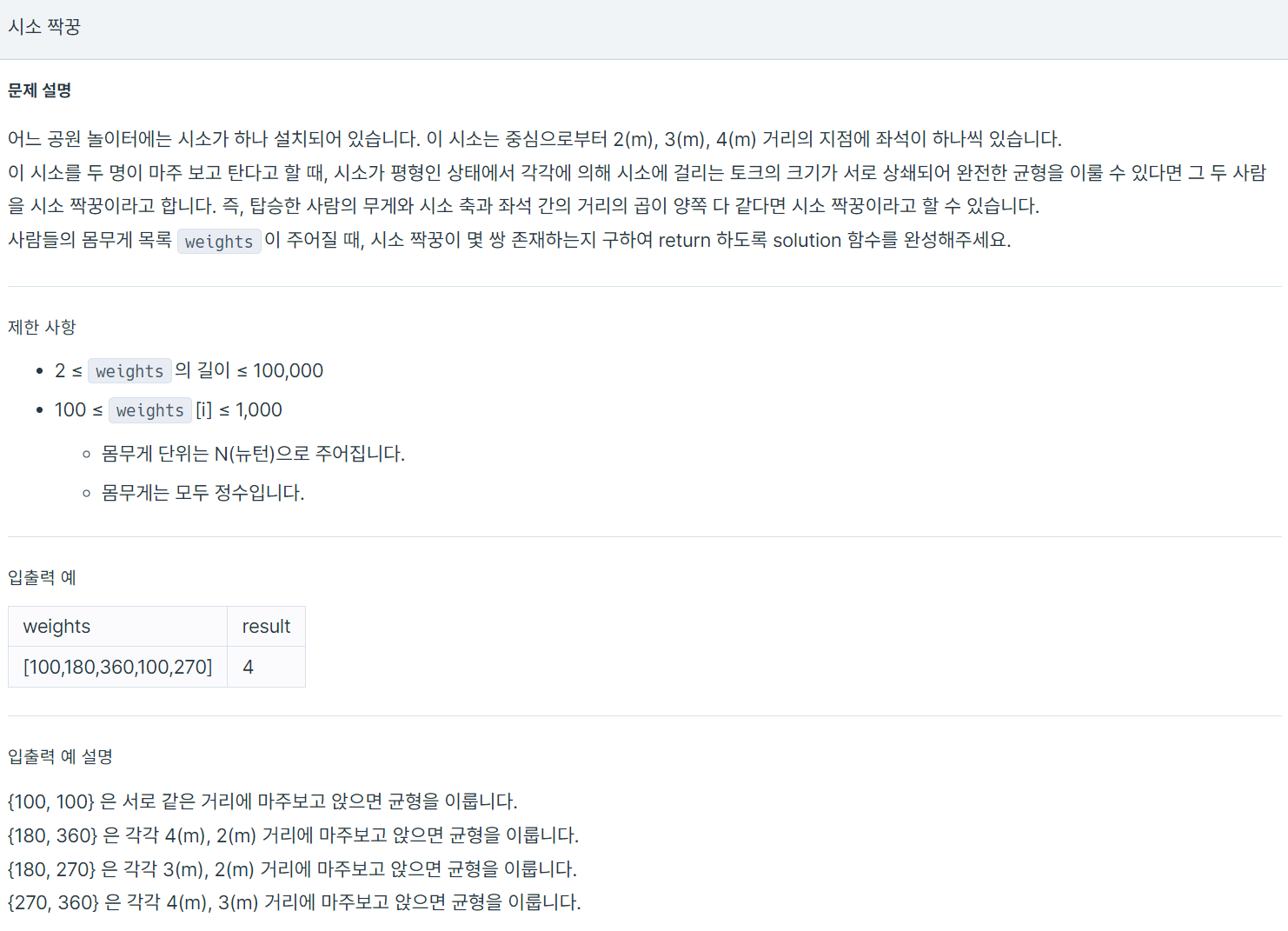 먼저 탑승한 사람을 정하고, 먼저 탑승한 사람의 토크를 계산합니다. 그리고 나머지 사람을 순회하며 토크를 구하고 먼저 탑승한 사람의 토크와 비교하여 같은 경우 answer 카운트를 올려줍니다.