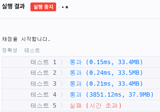 그러나 역시나 다음과 같이 시간초과라 결과를 만나게 됩니다.