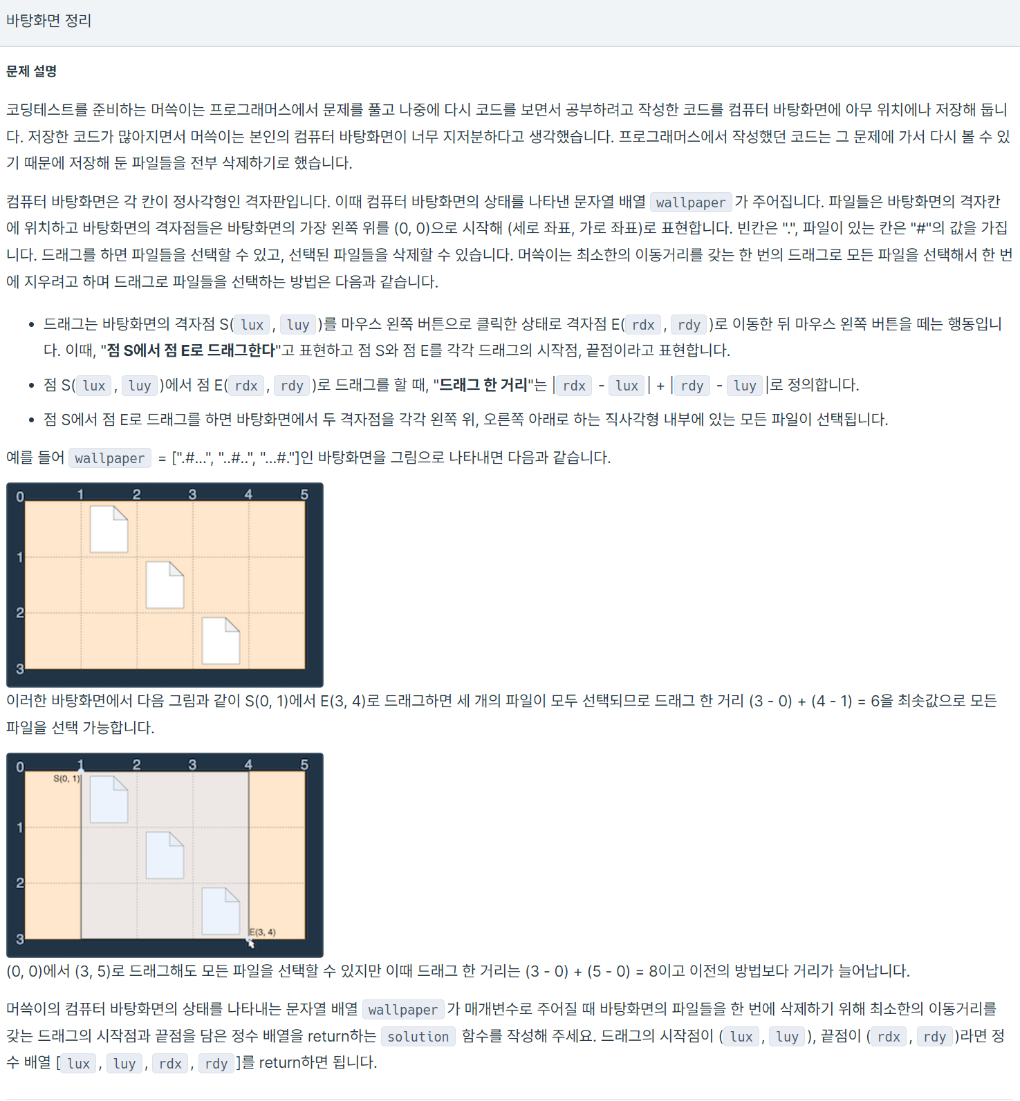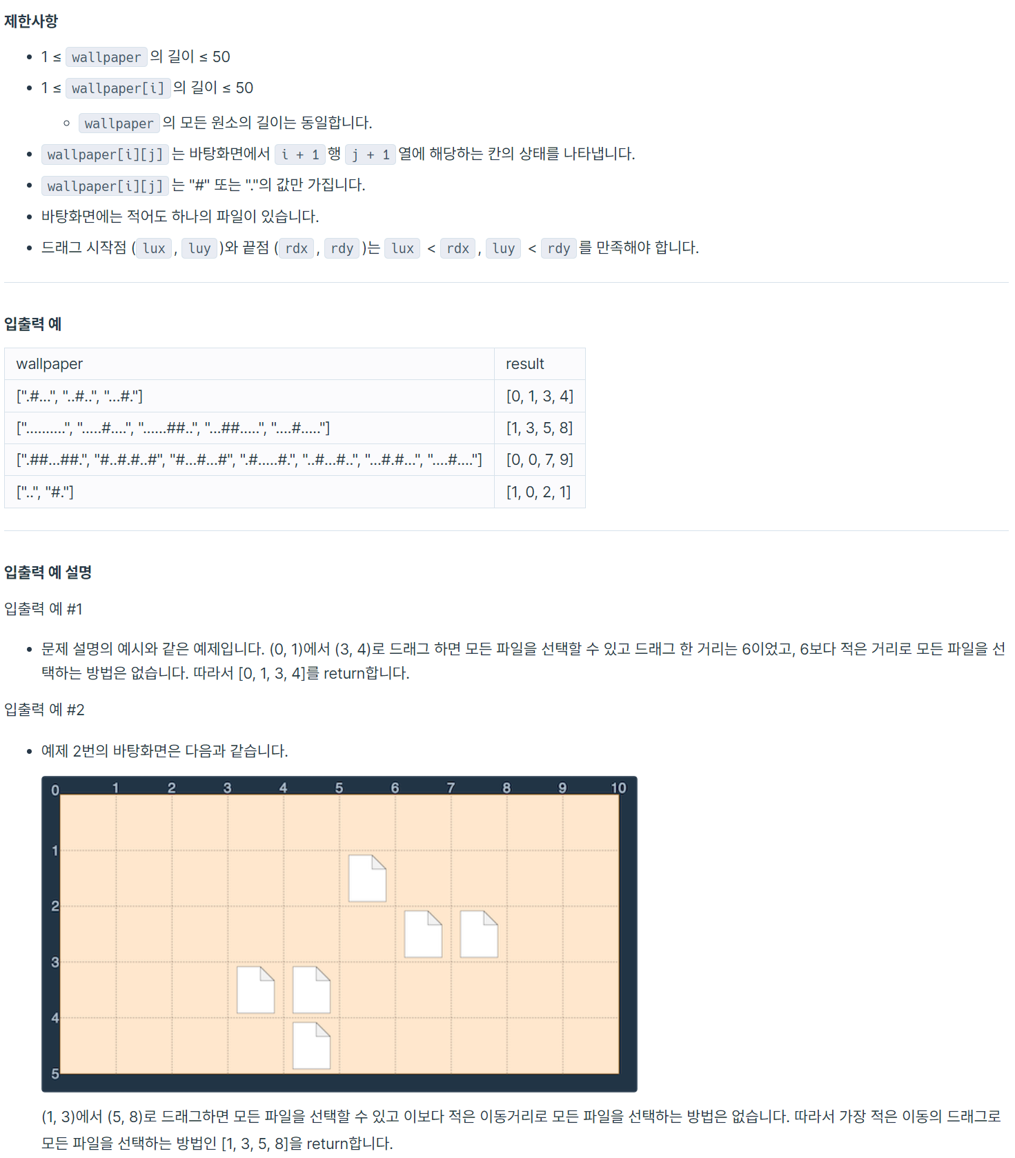 모든 좌표를 순회하며 파일을 찾아 최소 x, 최소 y, 최대 x, 최대 y를 각각 구해 하나의 배열에 담아 리턴하는 문제입니다. 새로 올라온 level 1이기도 하고, 주말이기도 하니 빠르게 코딩해보겠습니다.