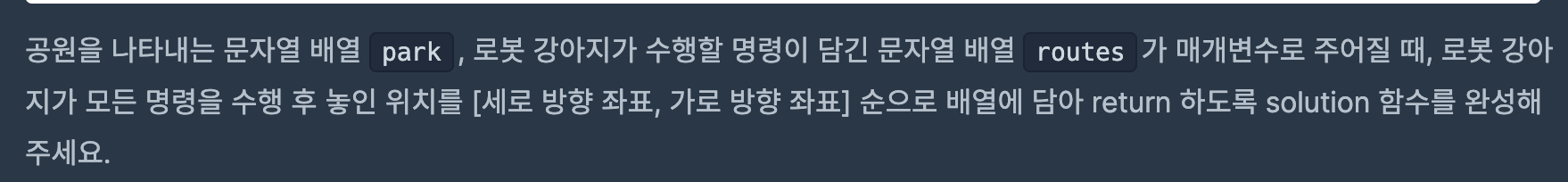 먼저 getPosition 함수를 이용해 최초의 위치 좌표를 answer에 할당합니다. getPosition 함수는 park를 순회하며 target 문자를 최초로 찾는 경우 해당 문자의 좌표를 리턴합니다.