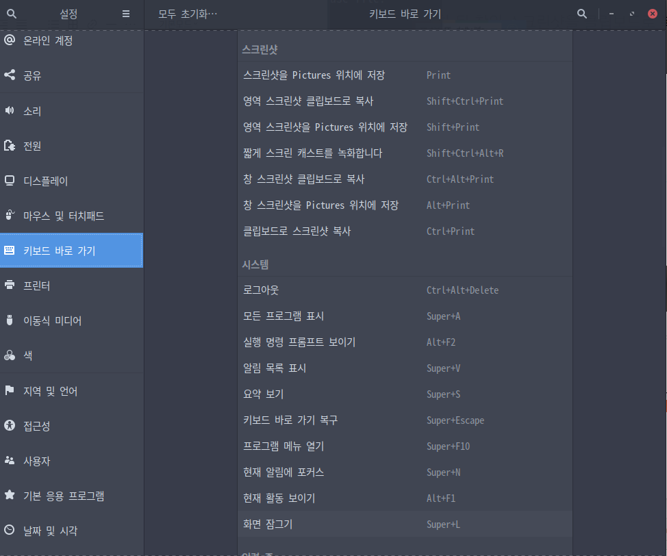 위의 단축키를 변경하고 싶다면, System Settings - keyboard / 설정 - 키보드 바로가기 로 들어간다.