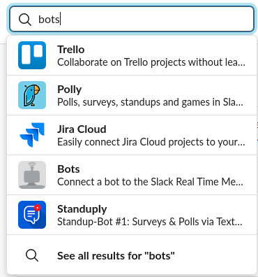 지난번에는 검색바에 webhook을 검색했지만, 이번에는 bots를 검색한다. 그러면 4번째에 Bots라는 친구가 보이는데 이 녀석이 우리에게 슬랙에서 사용할 수 있는 토큰을 제공해준다.