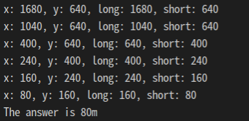 이 나머지 공간을 위와 같은 방식 ( 긴 변의 길이가 짧은 변의 2배 이상이라면, 2개의 큰 정사각형과 나머지를 구하는 방식 ) 에 적용하여 결과적으로 긴 변이 짧은 변의 2배가 될때의 짧은 변의 길이를 확인하면 된다.
