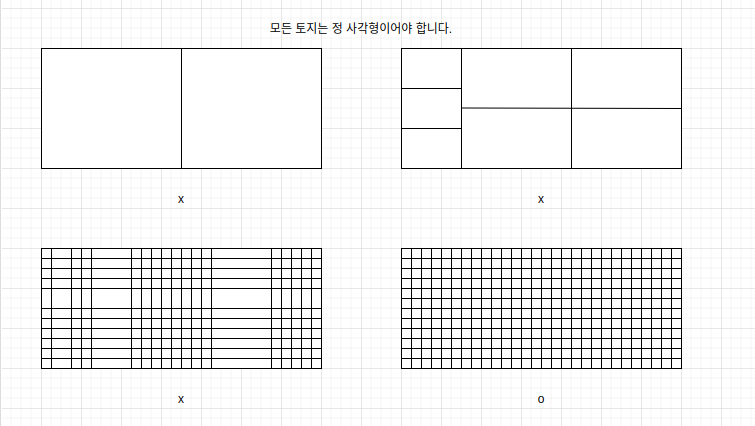 여러분이 농부이고, 위의 그림과 같은 농장을 가지고 있다고 가정한다. 이 농장을 똑같이 생긴 정사각형 토지로 나누고 싶습니다. 정사각형 토지의 크기는 최대한 컸으면 좋겠어요. 그러니까 아래 중 마지막처럼 전부 정사각형이 되도록 나누어야 해요. 물론 정사각형이 충분히 크다면요!