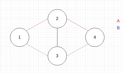 아래 그림은 균일 그래프이다. 1번 vertex에서 출발하여 4번 vertex에 도착하기까지의 최단경로는 A, B 둘 중의 하나이다.