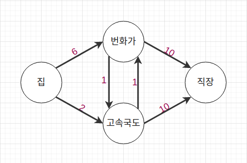우리는 직장까지 가야하기때문에 현재 집에서 직장까지의 가중치는 총 12이다. ( 집 -> 고속국도 -> 직장 )