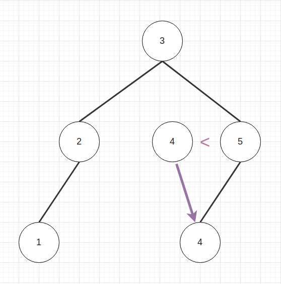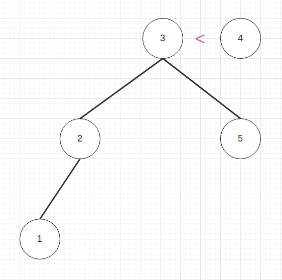 4는 3보다 크기에 3의 오른쪽 자식으로 내려간다. 4는 다시, 5보다 작기때문에 5의 왼쪽자식으로 내려가 결국 아래의 그림과 같은 형태로 트리맵이 형성된다.