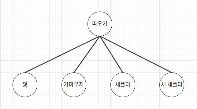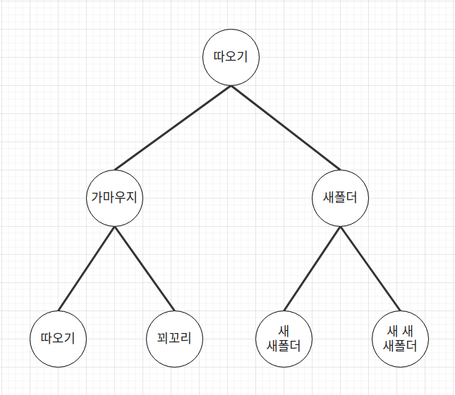 따오기라는 폴더 안에는 꿩, 가마우지, 새폴더, 새 새폴더 라는 이름의 4개의 폴더가 있다. 하나의 부모 아래에 여러개의 자식이 있는 구조. 이게 트리구조 다. 우리가 자료를 찾거나 정리하기 위해 사용하는 자료구조 중에서 트리를 기반으로 한 다양한 구조가 있다.