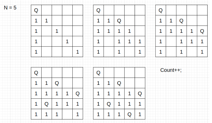퀸이 마지막 행에 놓일 수 있다는 말은, 모든 행에 퀸이 하나씩 자리잡았다는 말이고, 솔루션 중 하나를 완성했다는 뜻이다.