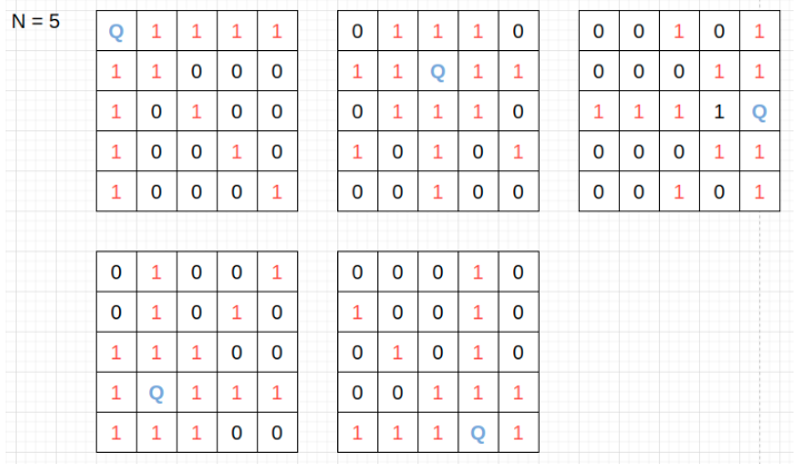 가령 아래와 같은 체스판이 있는 경우, 퀸이 놓인 자리를 1이라 하자.