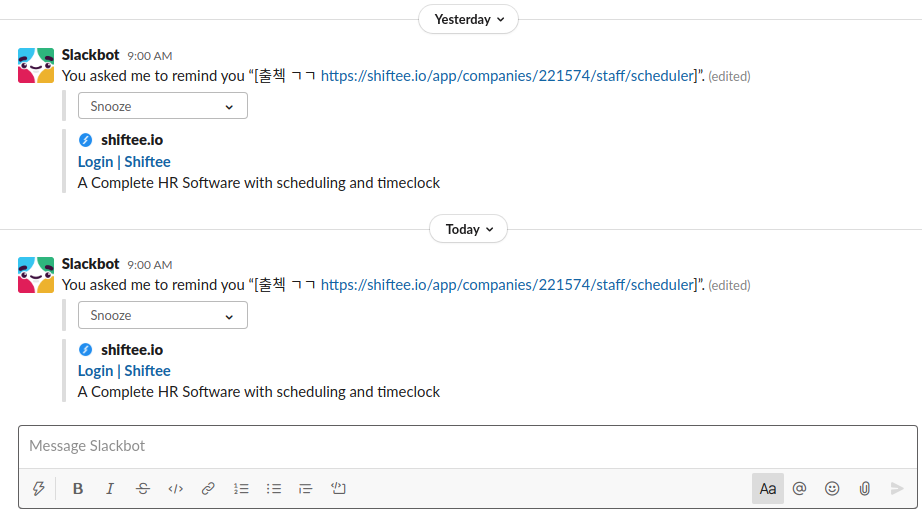 리마인더가 실행되면 설정해둔 시간에 Slackbot이 알려줘요! 위 사진은 1일차에 입력해둔 출근 리마인더가 어제와 오늘 알려준 사진입니다!
