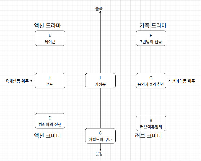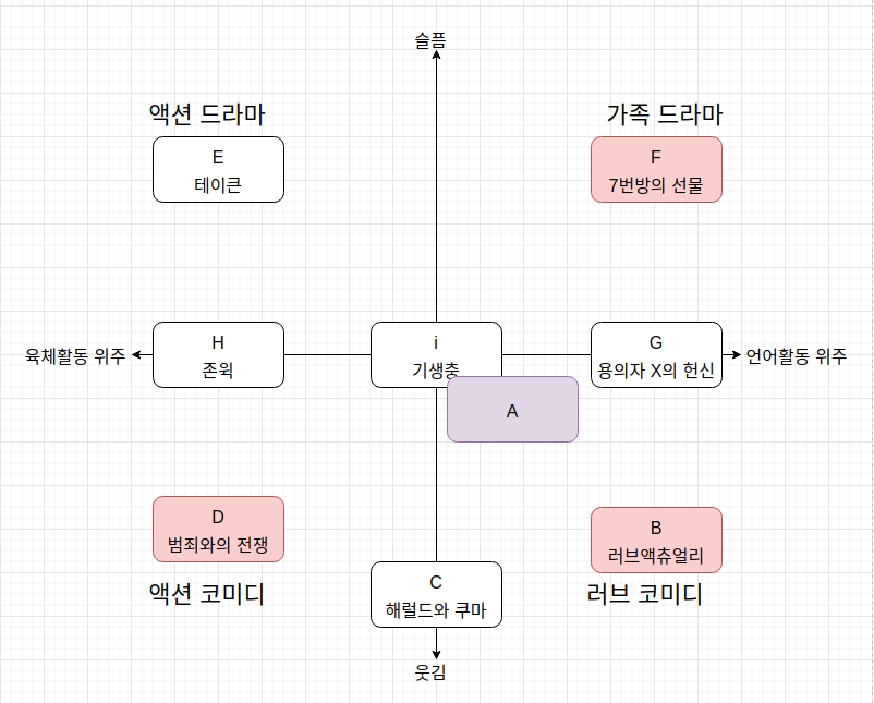 선택한 결과를 바탕으로 A의 위치를 결정했더니 A와 가장 가까운 곳에 위치한 유저는 i 이고, i의 가장 좋아하는 영화는 '기생충' 이다.
