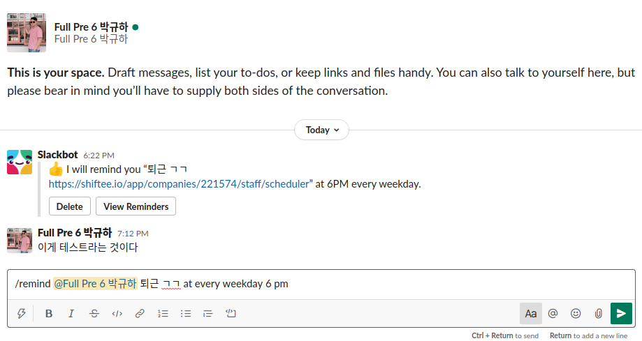 리마인더가 실행되면 설정해둔 시간에 Slackbot이 알려줘요! 위 사진은 1일차에 입력해둔 출근 리마인더가 어제와 오늘 알려준 사진입니다!